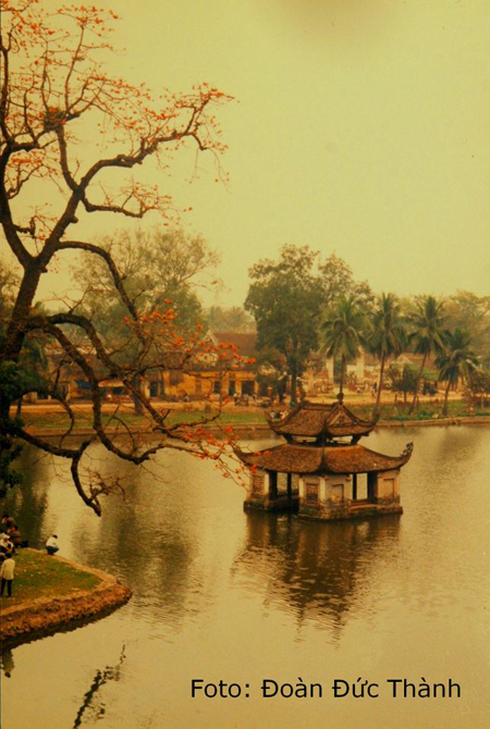 tháng hai âm lịch hàng năm hoa gạo nở đỏ rực rỡ, in hình đỏ rực dưới mặt nước.